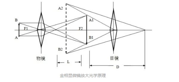 金相顯微鏡的成象放大部分主要由兩組透鏡組成??拷^察物體的透鏡叫物鏡,而靠近眼睛的透鏡叫目鏡。通過物鏡和目鏡的兩次放大,就能將物體放大到較高的倍數,見圖1,金相顯微鏡的放大光學原理圖。物體AB置于物鏡前,離其焦點略遠處,物體的反射光線穿過物鏡折射后,得到了一個放大的實象A1B1,若此象處于目鏡的焦距之內,通過目鏡觀察到的圖象是目鏡放大了的虛象A2B2。